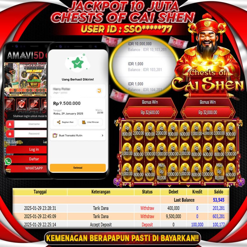 Kamis, 30 Januari 2025  Selamat kepada User id : Sso*****77 Telah berhasil mendapatkan kemenangan besar pada permainan CHESTS OF CAI SHEN kemenangan Sebesar Rp.10.000.000, Setelah mengisi formulir withdraw dengan kurung waktu hanya 5 – 10 menit pihak amavi5d sudah melakukan transfer kepada pemilik User id dan dana sudah dapat di cairkan oleh pemenang. Bukti pembayaran yang kami berikan merupakan bukti pembayaran yang SAH / VALID yang langung di dapatkan melaui tanda transfer transaksi dari Bank yang di tuju.