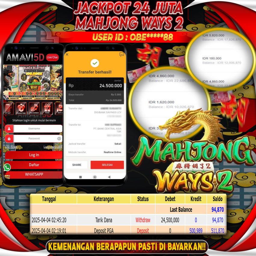 AMAVI5D JACKPOT SLOT MAHJONG WAYS 2 Rp 24.000.000 Jumat, 04 April 2025